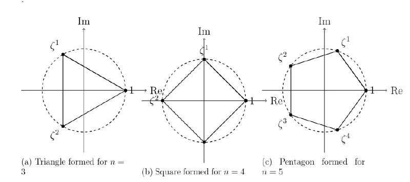 It is well known that the “roots of unity” \( x^n=1 \) are equally distributed across a circle. Since the angles formed are equal, connecting the endpoints would create a regular polygon. To graph this figure, we must find an expression for the vertices.